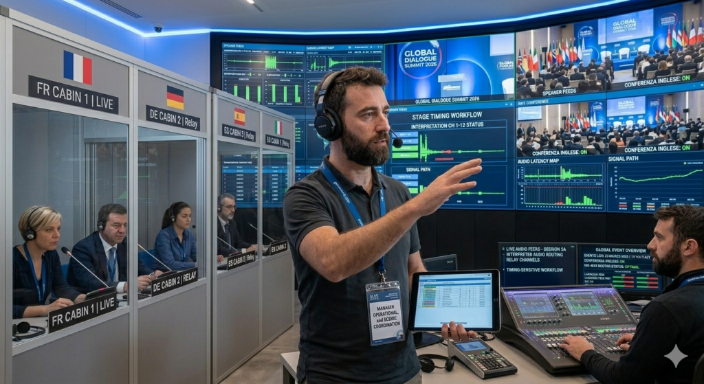 Managing an international, multilingual event requires far more than technical expertise: it demands a unified vision capable of coordinating people, languages, technologies, and timing with absolute precision. This is why the presence of a highly skilled Manager responsible for Technical, Operational, and Scenic Coordination is essential—especially in events that rely on conference interpreters, simultaneous interpreting services, and advanced multilingual communication systems.