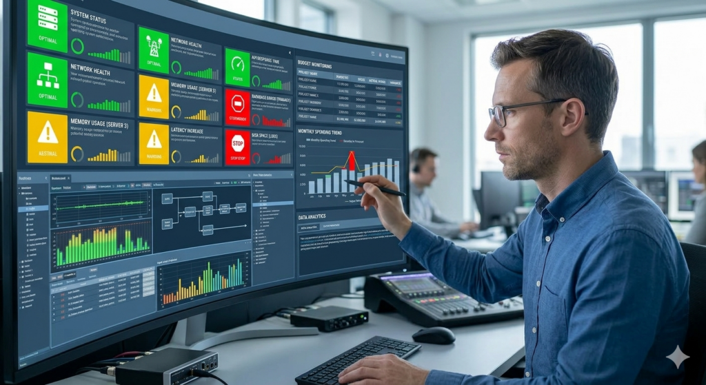 A project manager reviewing a digital dashboard that shows system health and budget tracking icons