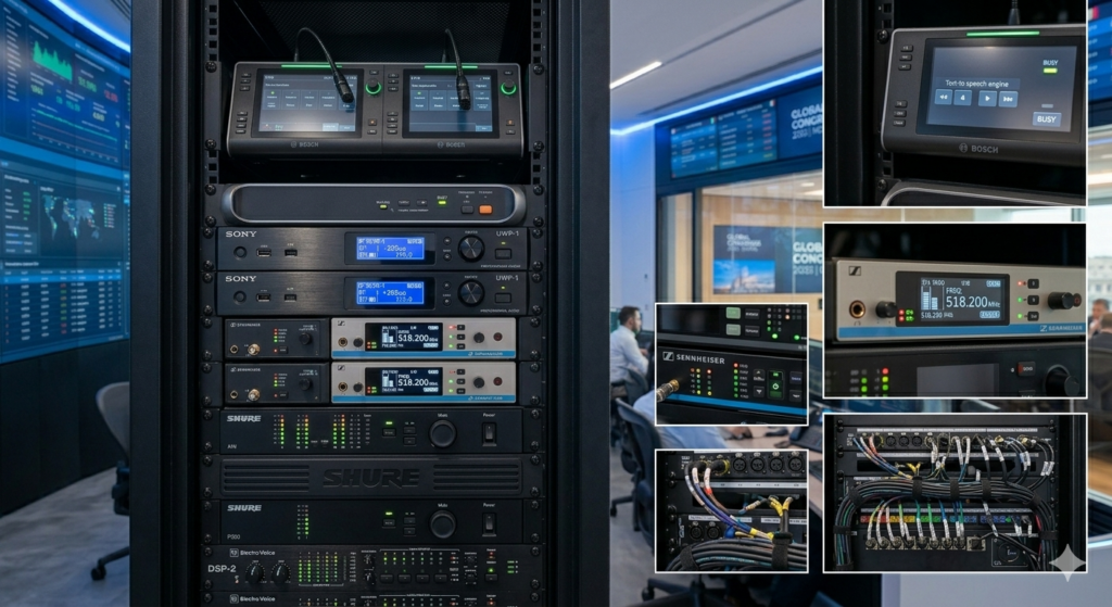 A close-up collage of premium equipment logos—Bosch, Shure, and Sony—installed neatly in a professional rack