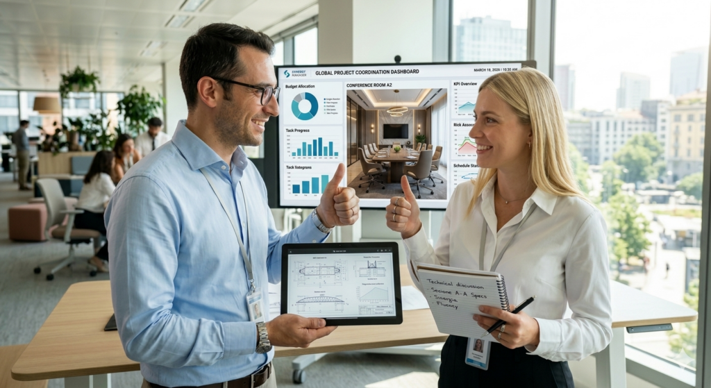 An action shot of an engineer and an interpreter giving a “thumbs up” or reviewing a technical plan, symbolizing the harmony between tech and talk