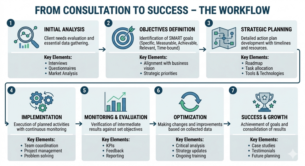 An infographic illustrating the “Consultancy-to-Success” workflow